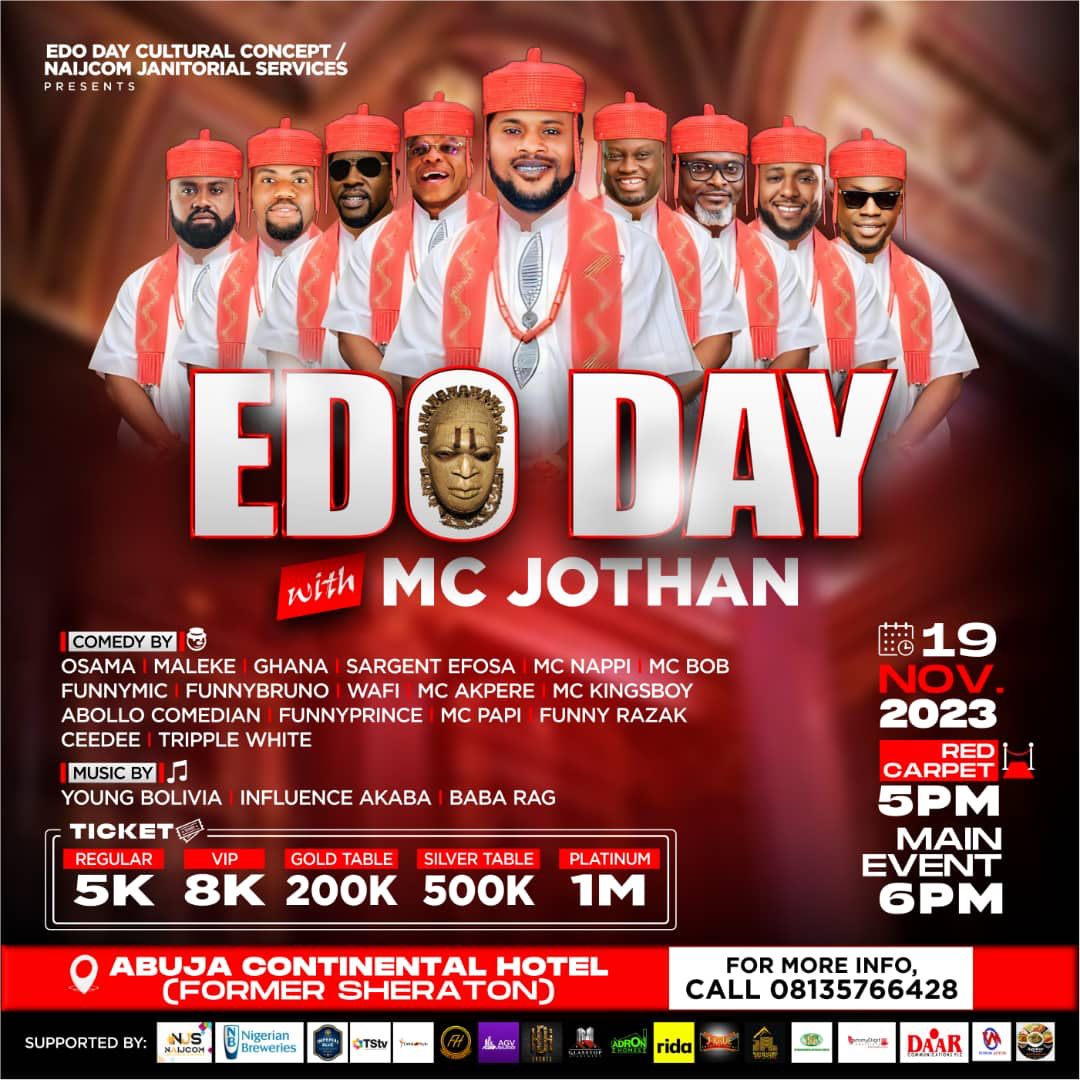 The 2023 edition of Edo Day With MC Jothan will be a blast as top entertainers, including comedians, music artistes, Nollywood actors and socialites have been assembled to grace the annual event.