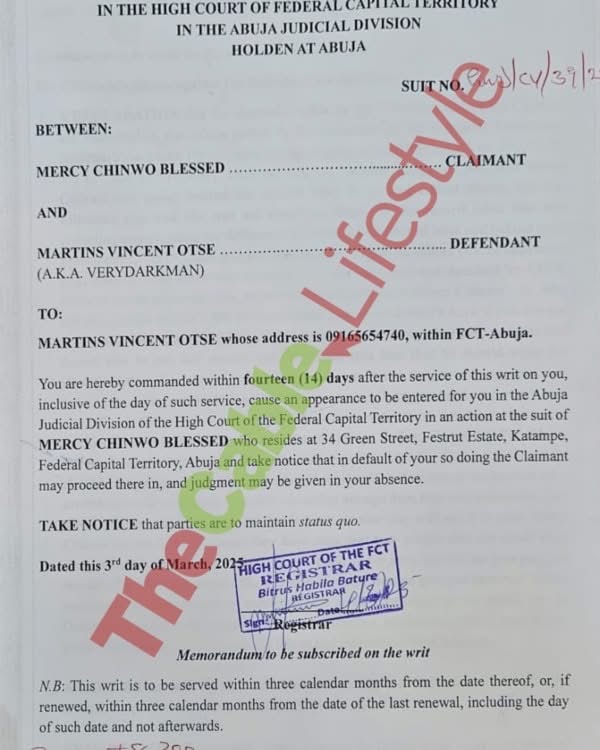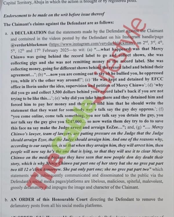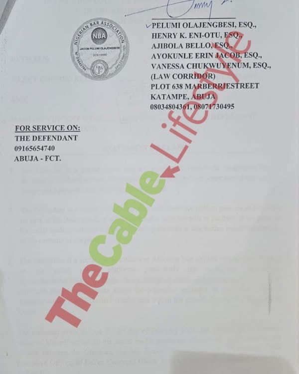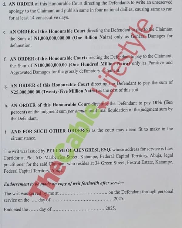According to court documents, Chinwo is seeking N1 billion in general damages, N100 million in punitive and aggravated damages, and an additional N25 million to cover the cost of the lawsuit.