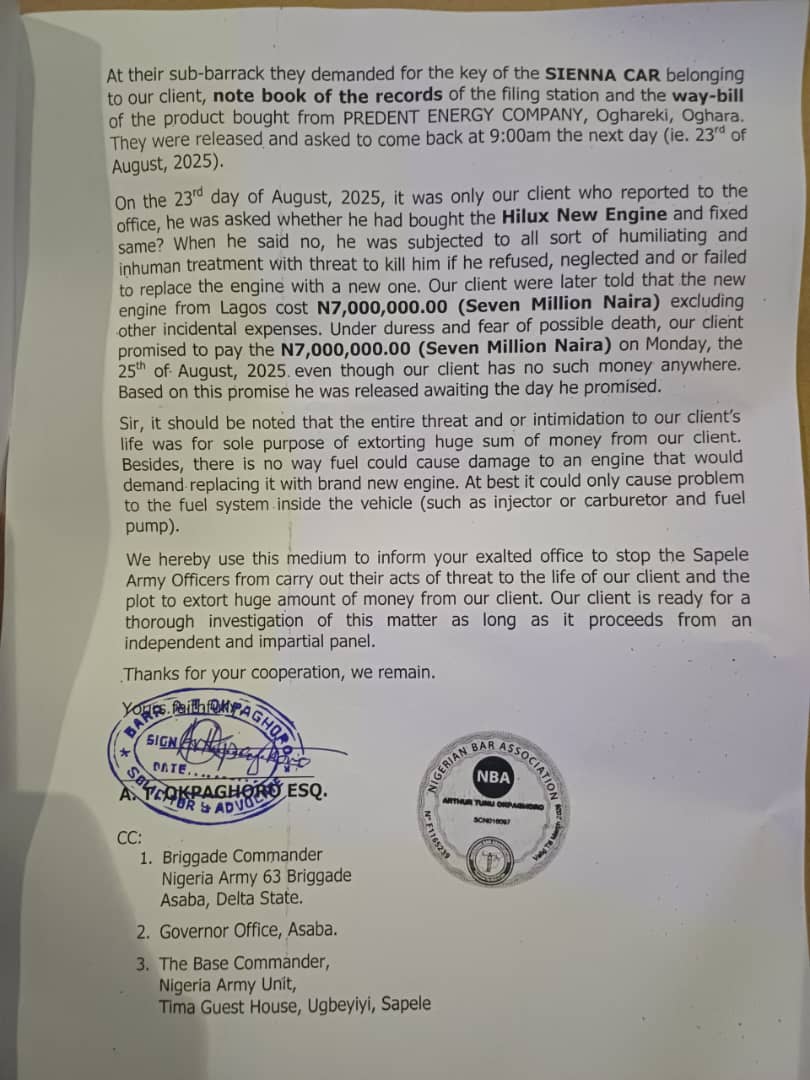 Meanwhile, the head of the Army in the said sub-barrack, in Sapele, ordered the arrest and wrongful detention of both the manager Pastor Armstrong Odeta, and the fuel attendant, Mr Avwerosuo Avwonyen, at the Sapele Divisional Police Station, around 7:00 pm until around 6:00 am the next day morning of 22nd of August, 2025, after brutalizing them and forcing the manager under duress to agree to pay the sum of N7,000,000 to buy a brand new engine in Lagos and another additional N1,000,000 to fix it, excluding other incidental expenses. Such actions are utterly uncivilized, philistine and totally barbarous.