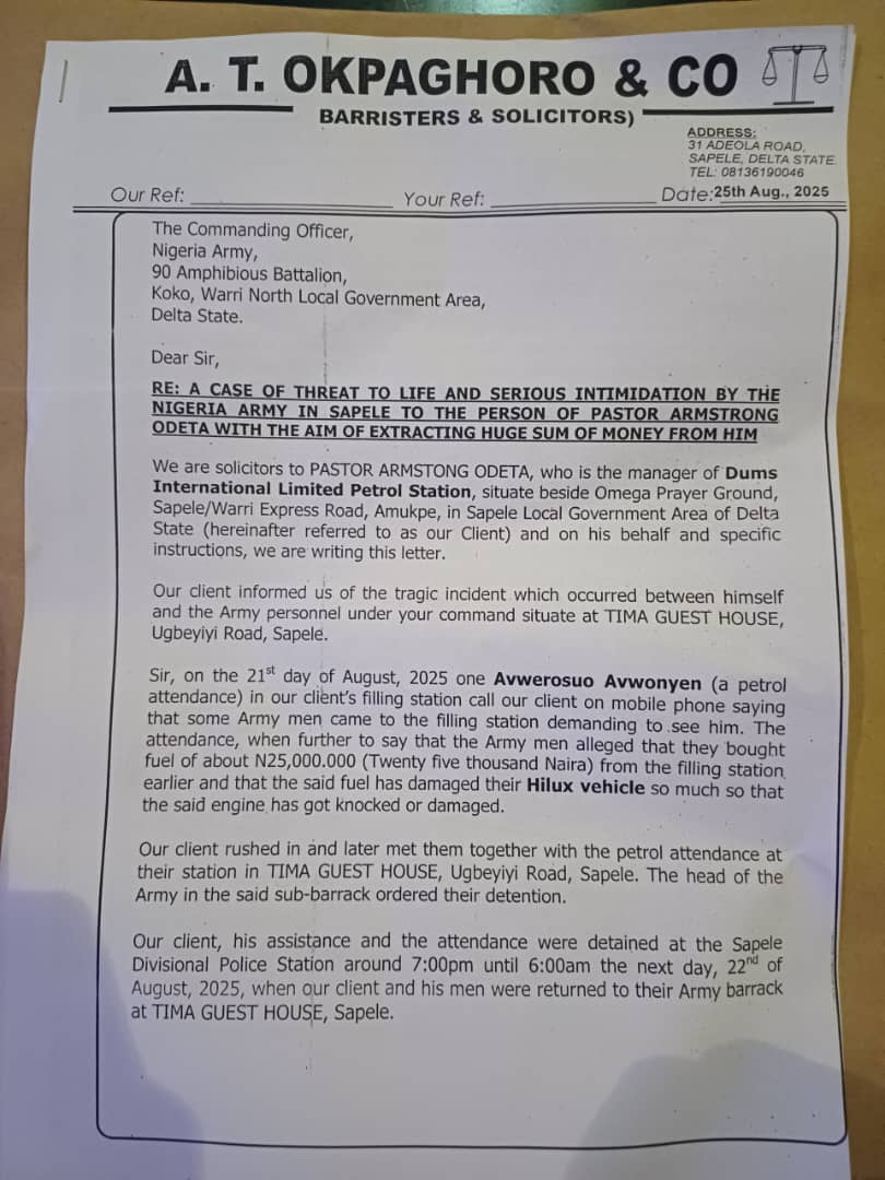 Meanwhile, the head of the Army in the said sub-barrack, in Sapele, ordered the arrest and wrongful detention of both the manager Pastor Armstrong Odeta, and the fuel attendant, Mr Avwerosuo Avwonyen, at the Sapele Divisional Police Station, around 7:00 pm until around 6:00 am the next day morning of 22nd of August, 2025, after brutalizing them and forcing the manager under duress to agree to pay the sum of N7,000,000 to buy a brand new engine in Lagos and another additional N1,000,000 to fix it, excluding other incidental expenses. Such actions are utterly uncivilized, philistine and totally barbarous.