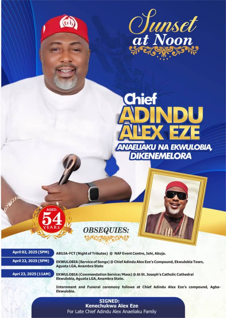 On April 22, 2025 a Service of Songs will hold at Chief Adindu Alex Eze’s compound in Ekwulobia Town, Aguata LGA Anambra State.