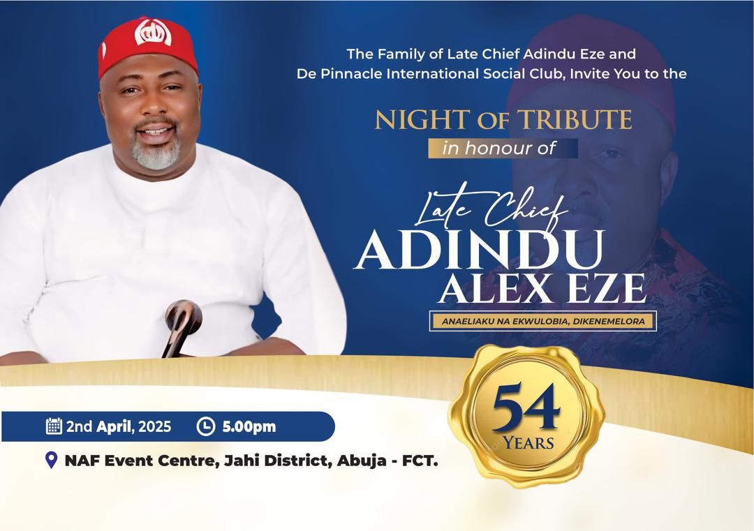 On April 22, 2025 a Service of Songs will hold at Chief Adindu Alex Eze’s compound in Ekwulobia Town, Aguata LGA Anambra State.