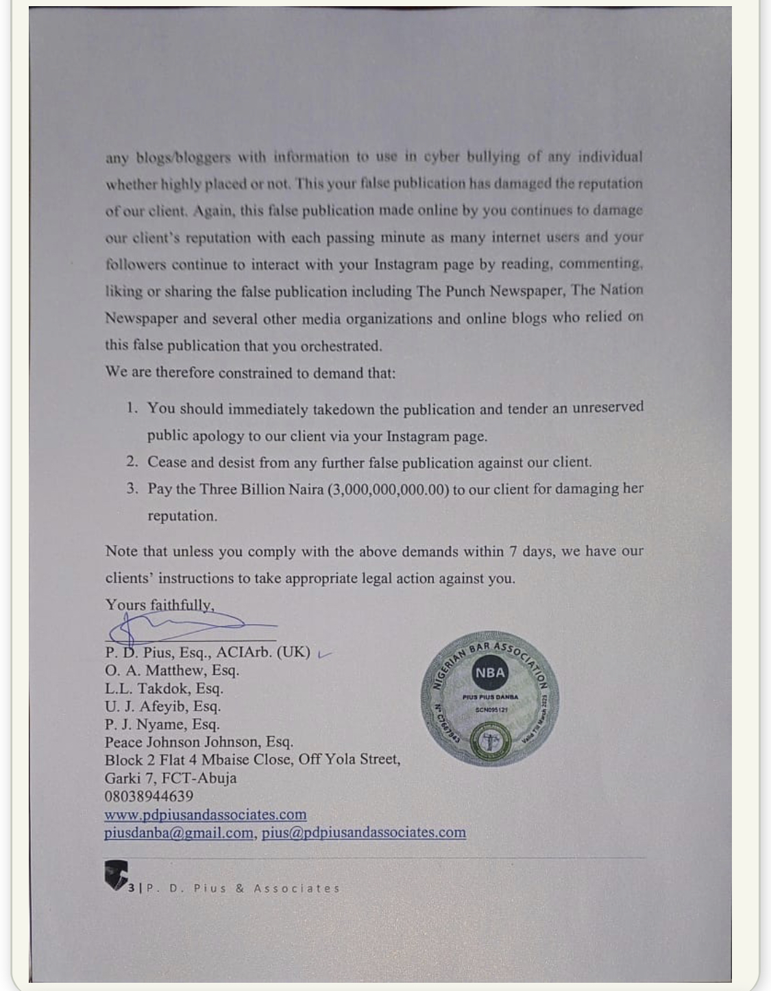 The demand letter includes a stern request for Rollas to take down the original Instagram post, issue a public apology, and pay a staggering three billion naira (approximately $7.5 million) for the damage to Halima’s reputation. “Your false publication has damaged the reputation of our client and continues to do so with each passing minute,” the letter asserts, pointing to the wide reach of Rollas’ initial statement across various media platforms.
