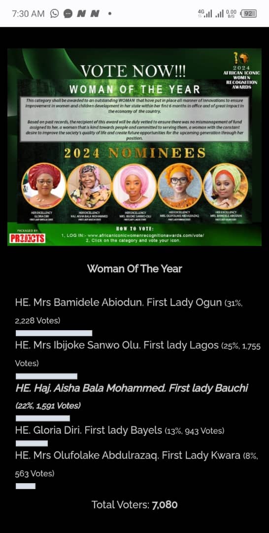 Aishatu Mohammed, wife of Bauchi Governor, and Gloria Diri wife of Bayelsa state governor, Olufolake Abdulrazaq wife of Kwara state governor polled 1,591, 943 and 563 respectively to come third, fourth and fifth.