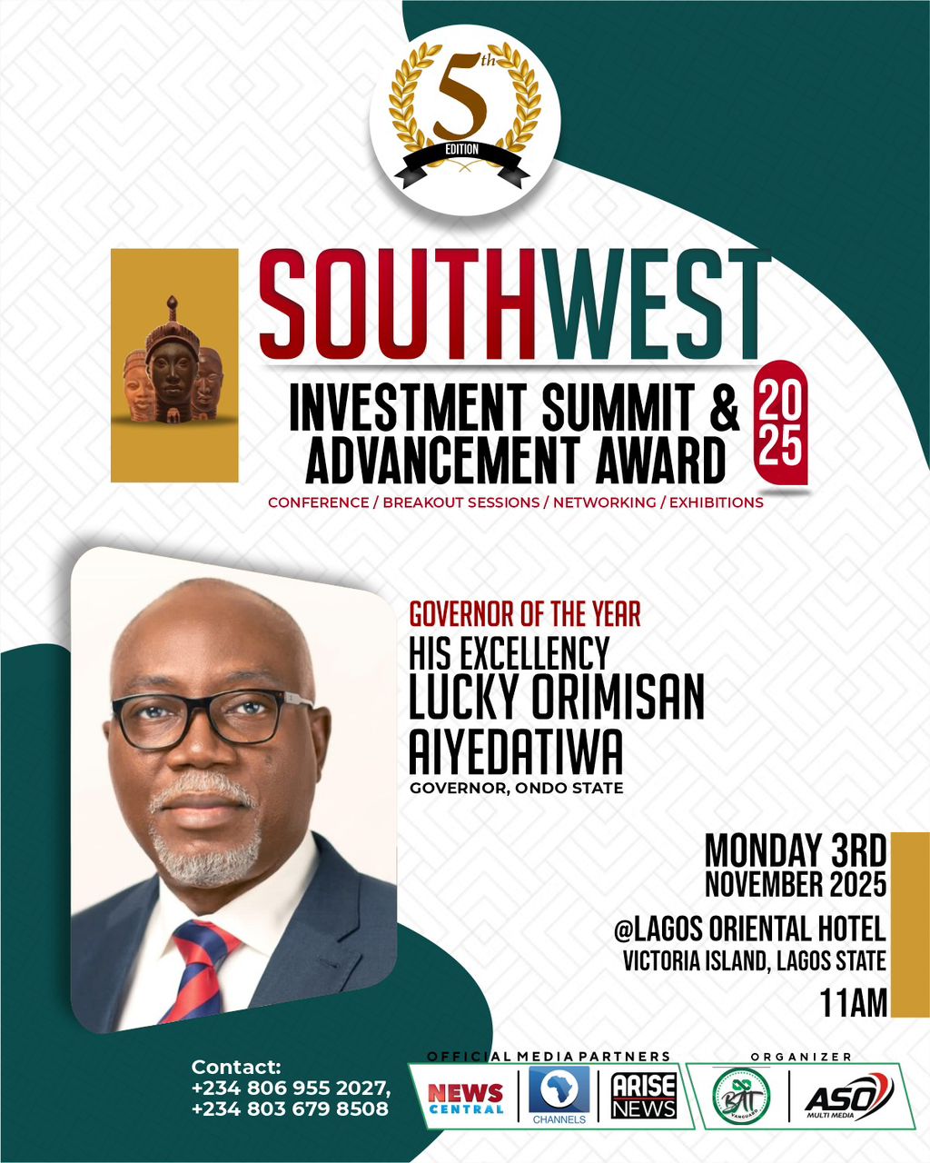 Lagos, Nigeria – In a resounding endorsement of his transformative administration, the Executive Governor of Ondo State, His Excellency Lucky Orimisan Aiyedatiwa, will be conferred with the “Governor of the Year Award” at the upcoming 5th South West Investment Summit and Advancement Awards 2025. The award recognises his outstanding leadership, commitment to good governance, and monumental contributions to the socio-economic development of both Ondo State and the wider South West region.