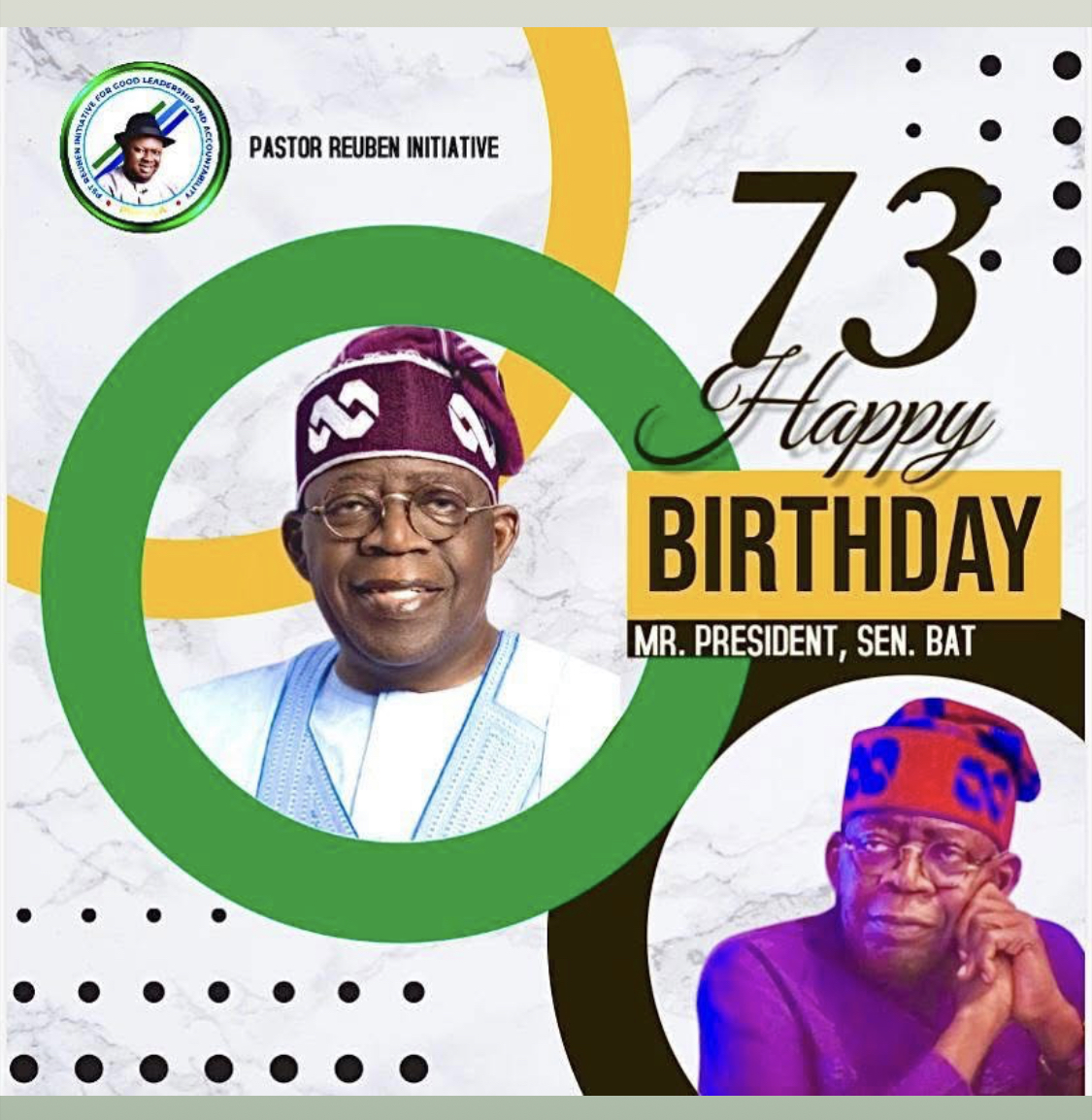 Chief Pastor Reuben Clifford Wilson, the president and founder of Pastor Reuben Initiative for Good Leadership and Accountability, and the South-South Zonal Coordinator of The Asiwaju Group, has extended his heartfelt felicitations to President Bola Ahmed Tinubu, on the occasion of his 73rd birthday.