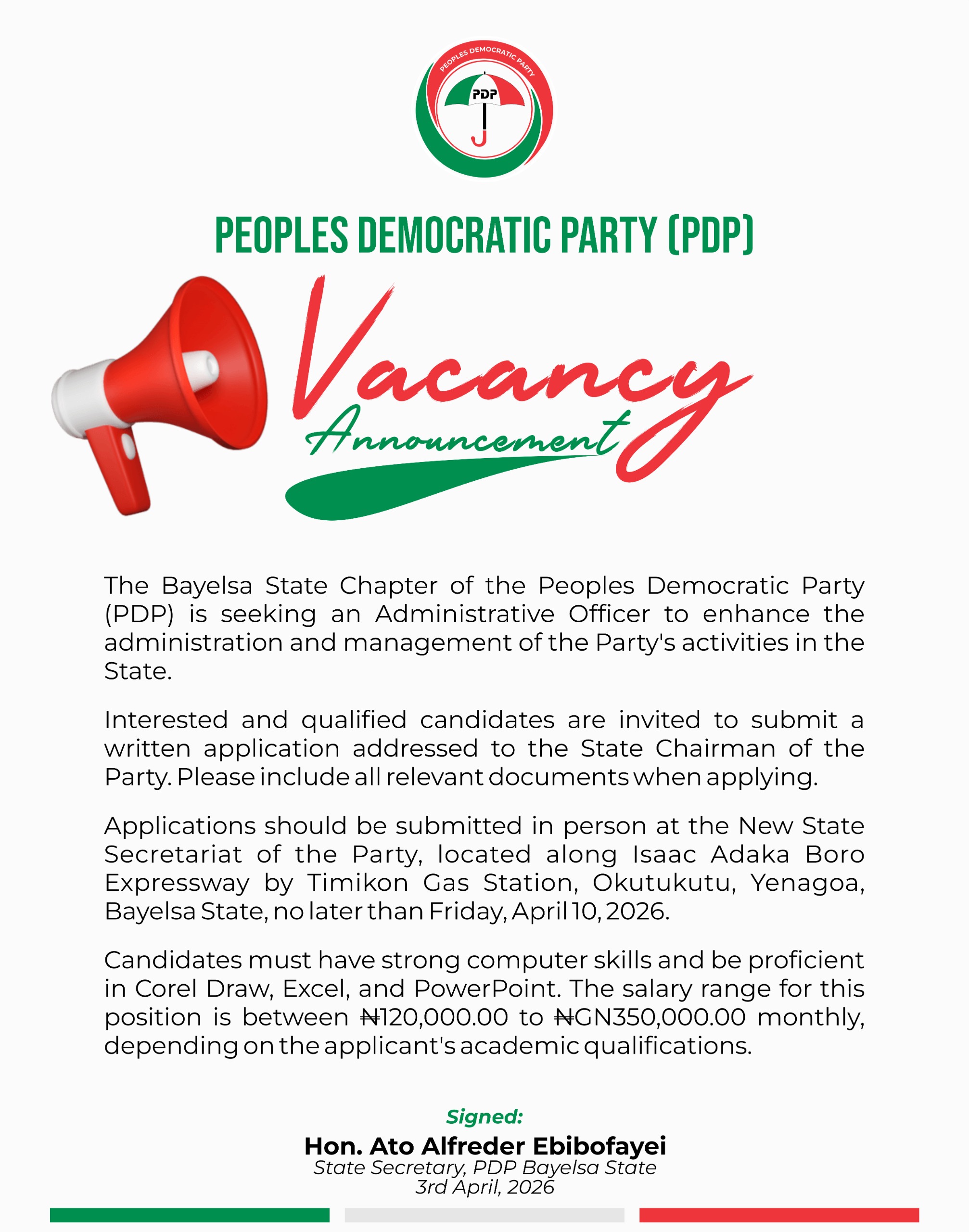 The Peoples Democratic Party (PDP), Bayelsa State Chapter, has announced a vacancy for the position of Administrative Officer as part of efforts to strengthen the administration and management of its activities within the state.