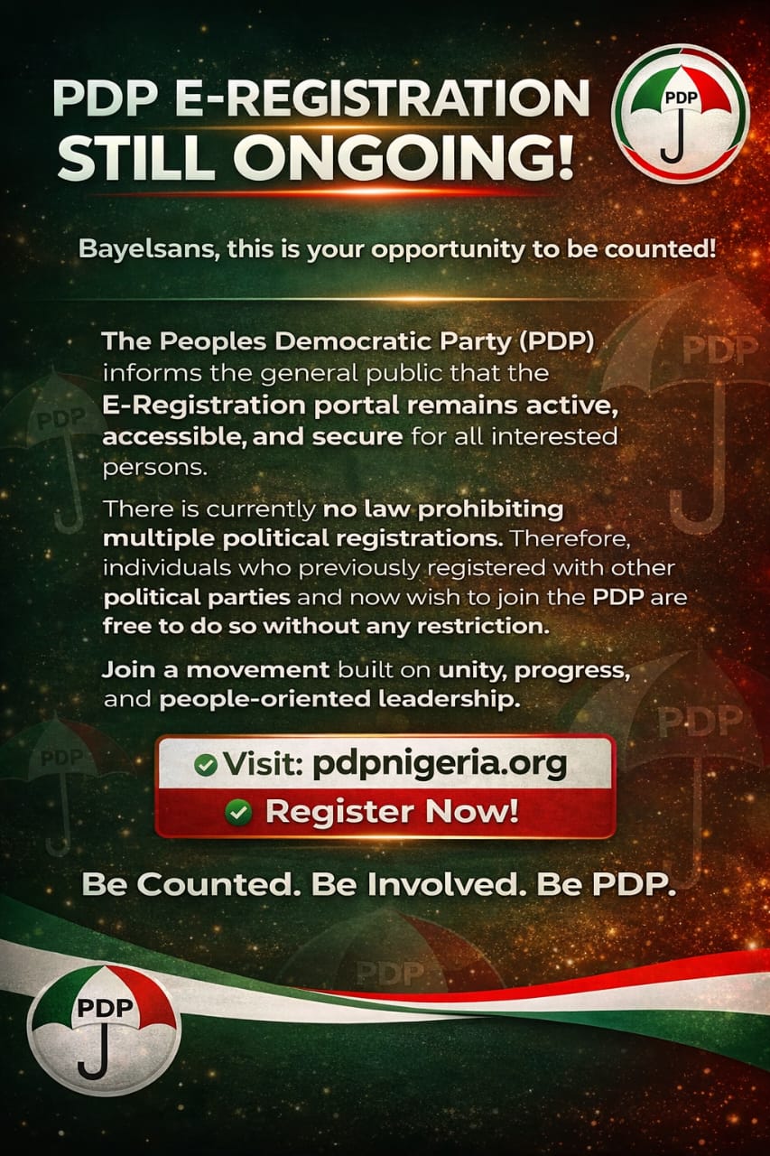 The Peoples Democratic Party (PDP) wishes to inform all Bayelsans that the E-Registration portal remains active, open, and fully secure for new and intending members across the State.