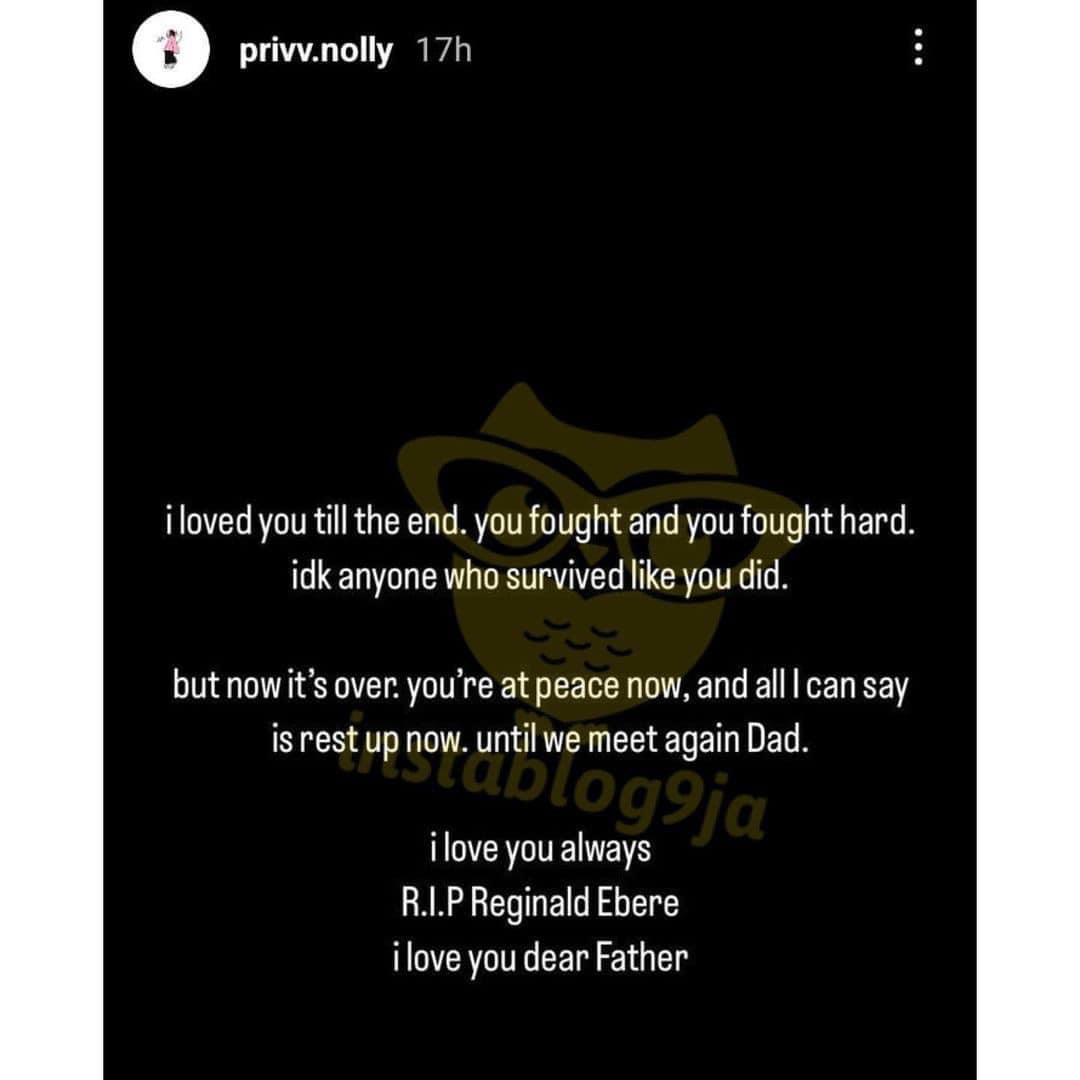 Veteran entertainer and actor, Segun Arinze broke the news on Nollywood Giants, a WhatsApp platform created for notable Nigerian entertainers on Sunday, where he lamented the painful loss of Ebere.