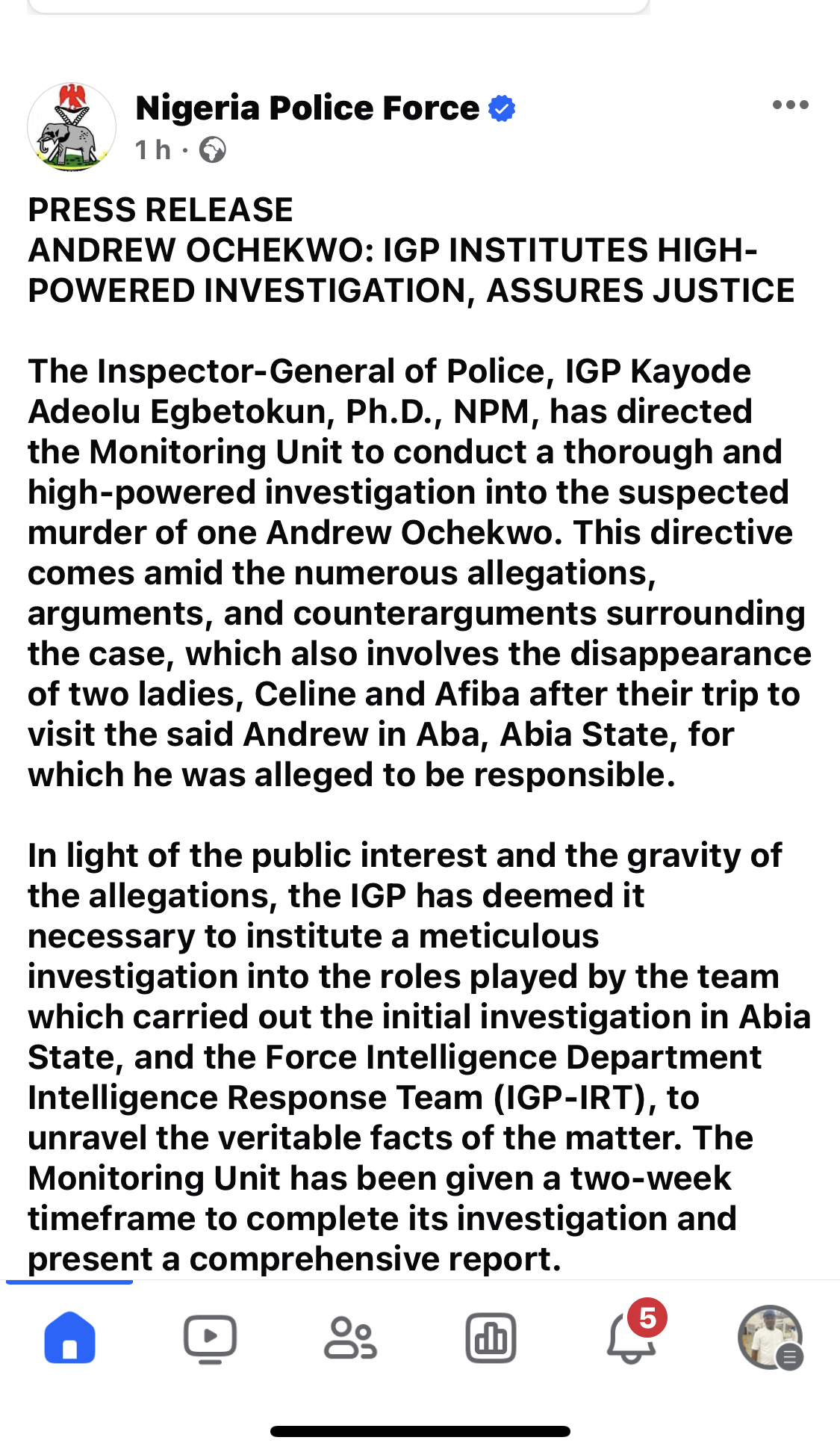 The Inspector-General of Police, IGP Kayode Adeolu Egbetokun, Ph.D., NPM, has directed the Monitoring Unit to conduct a thorough and high-powered investigation into the suspected murder of one Andrew Ochekwo. This directive comes amid the numerous allegations, arguments, and counterarguments surrounding the case, which also involves the disappearance of two ladies, Celine and Afiba after their trip to visit the said Andrew in Aba, Abia State, for which he was alleged to be responsible.