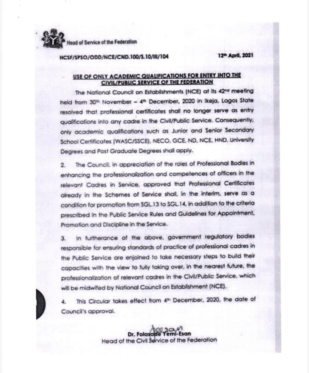 The circular personally signed by Yemi-Esan reads in part, “The National Council on Establishment (NCE) at its 42nd meeting held from 30th November – 4th December 2020 in Ikeja, Lagos state resolved that professional certificates shall no longer serve as entry qualifications into any cadre in the Civil/Public Service. Consequently, only academic qualifications such as Junior and Senior Secondary School Certificates (WASC/SSCE), NECO, GCE, ND, NCE, HND, University degrees and postgraduate degrees shall apply”.