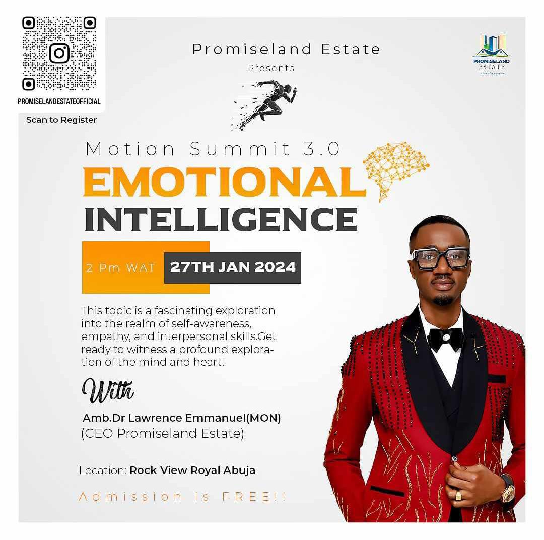 In an effort to assist residents of Abuja, the nation’s capital with the knowledge of self-discovery, a leading real estate firm, Promiseland Estate has concluded arrangements to hold its third edition of emotional intelligence summit.