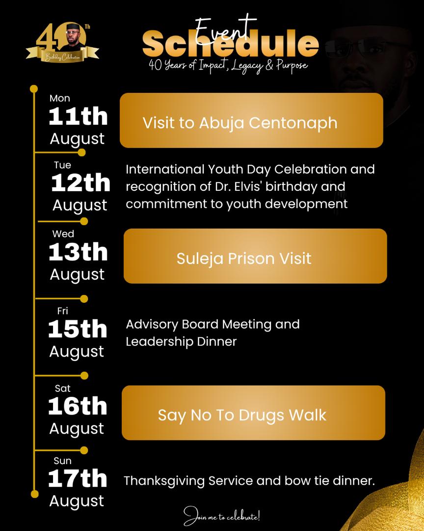 There will be a visit to Suleja prison on Wednesday, August 13, while on Friday, August 15, there will be an Advisory Board Meeting and Leadership Dinner.