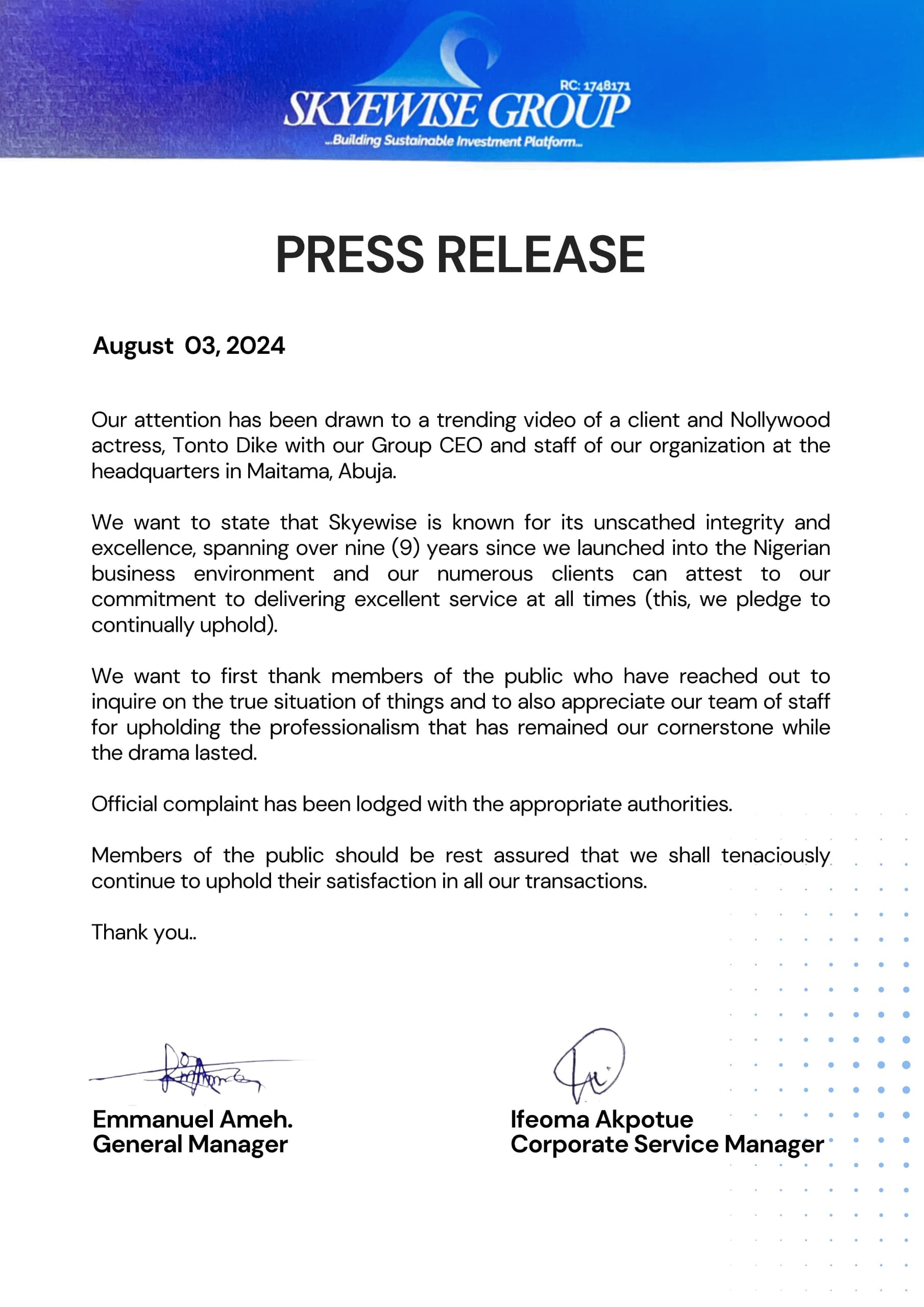 “The management of Skyewise Group is aware of a trending video of our client and Nollywood star, Tonto Dike with staff of our organization at the headquarters in Maitama, Abuja.