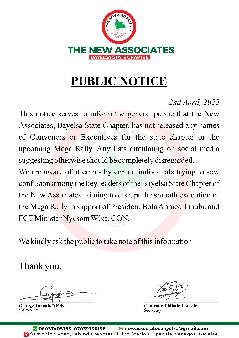 This Notice Serves to inform the General Public that the New Associates , Bayelsa State Chapter, has not released any names of Conveners or Executives for the state Chapter or the upcoming Mega Rally.
