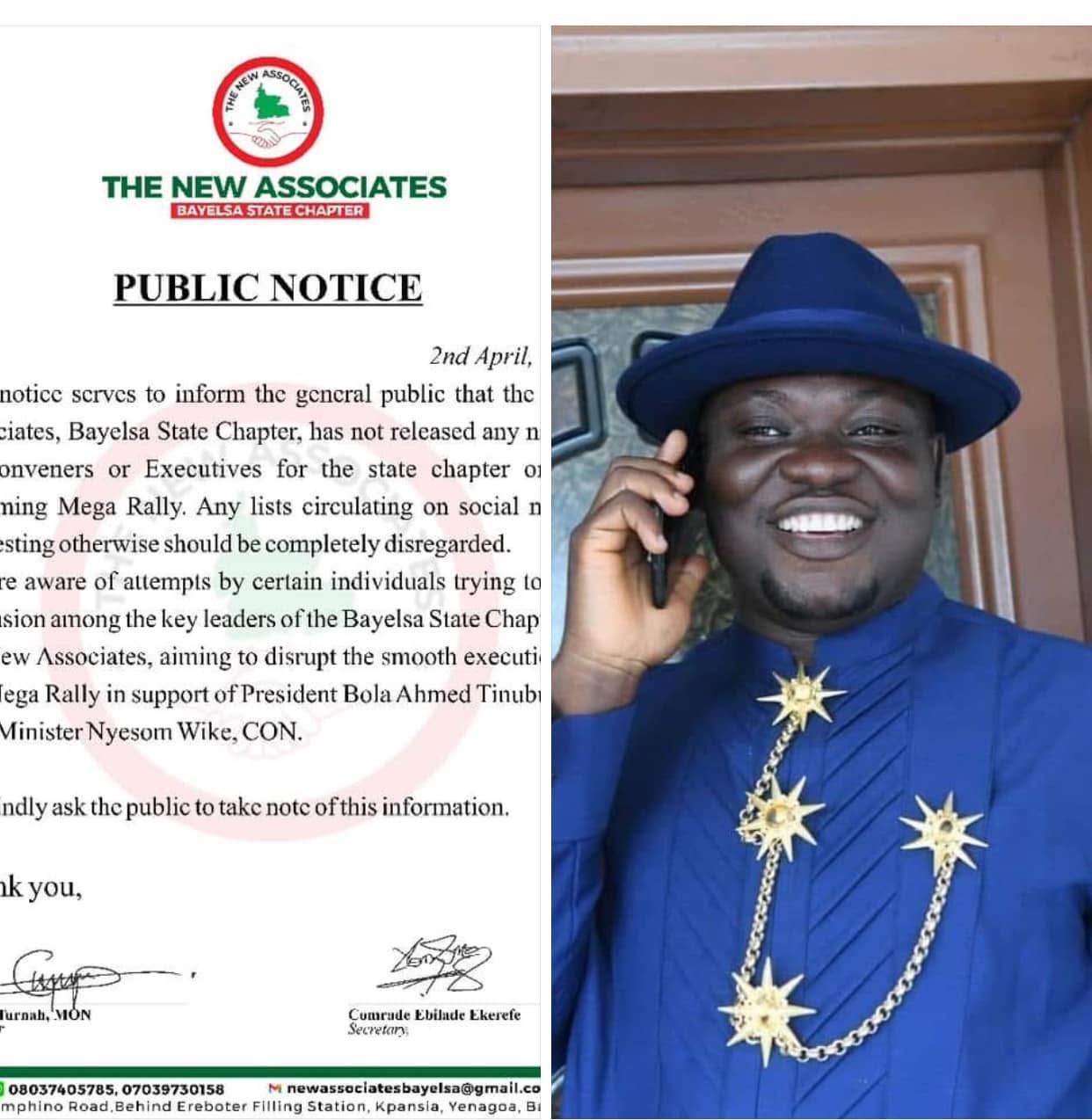 This Notice Serves to inform the General Public that the New Associates , Bayelsa State Chapter, has not released any names of Conveners or Executives for the state Chapter or the upcoming Mega Rally.