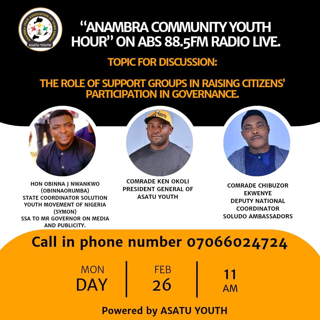 The trio are to appear on the flagship programme, “Anambra Community Youth Hour” on Anambra Broadcasting Service (ABS) 88.5FM on Monday, February 26, 2024.