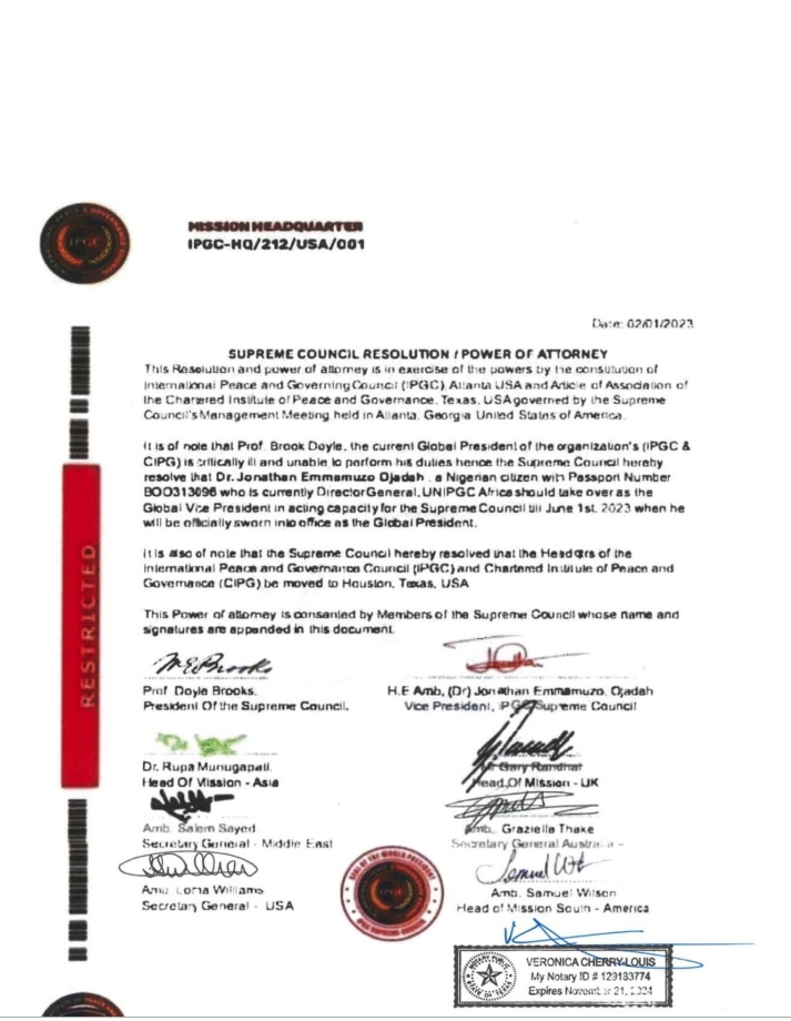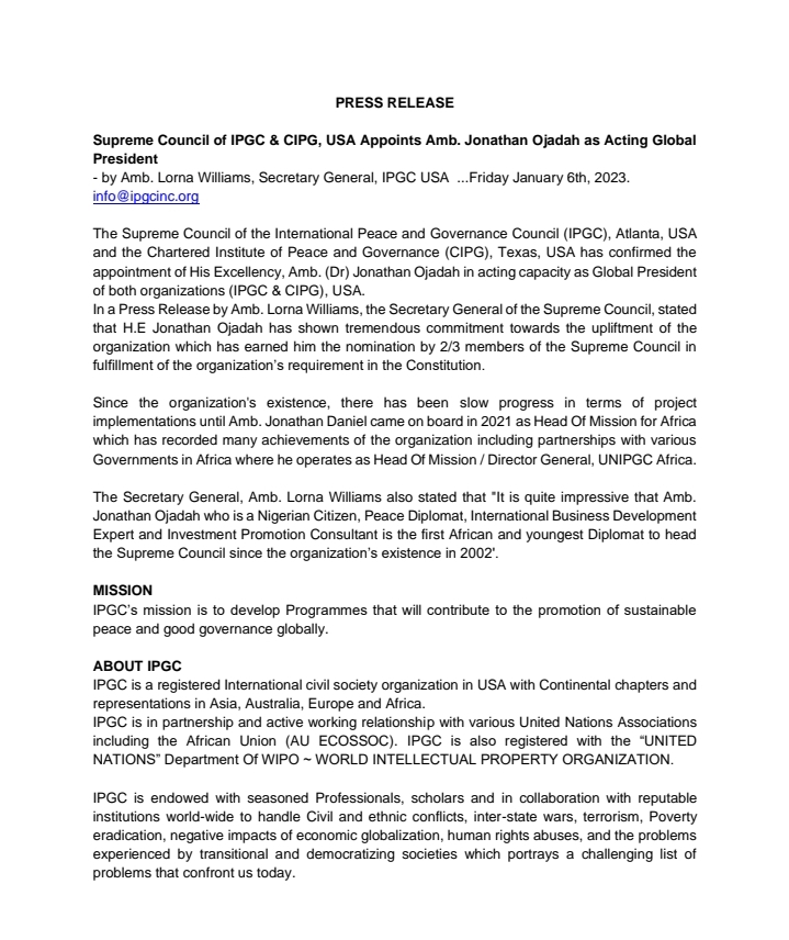 *Supreme Council of IPGC & CIPG, USA Appoints Amb. Jonathan Ojadah as Acting Global President*