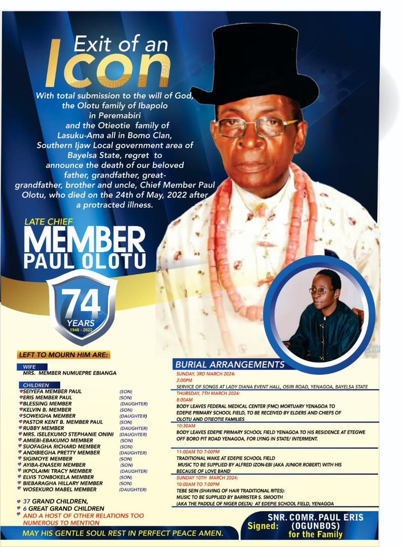 Get ready for an unforgettable event as the Olotu and Otieotie families come together to honor the life of the late Chief Member Paul Olotu. This remarkable man, aged 74, sadly passed away on Tuesday, May 24, 2022.
