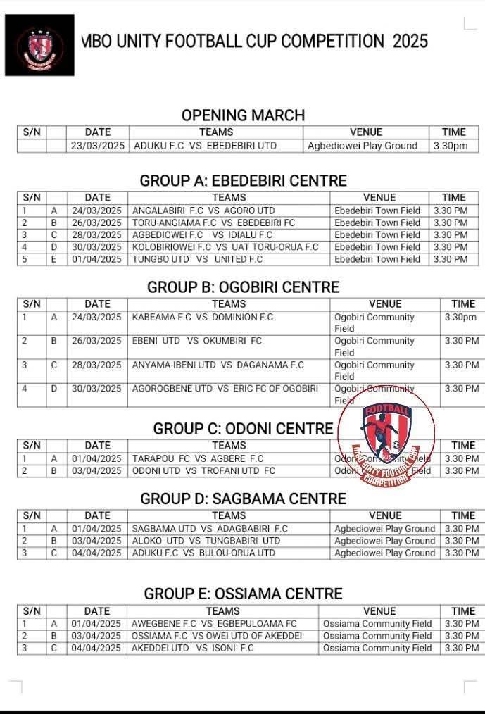 The kick-off of this competition is scheduled to hold on the 23rd of March, 2025 at Agbadiowei Playground, Mile 3, Sagbama Town, Bayelsa State, by 3pm. Other matches will follow suit as scheduled in other designated centres