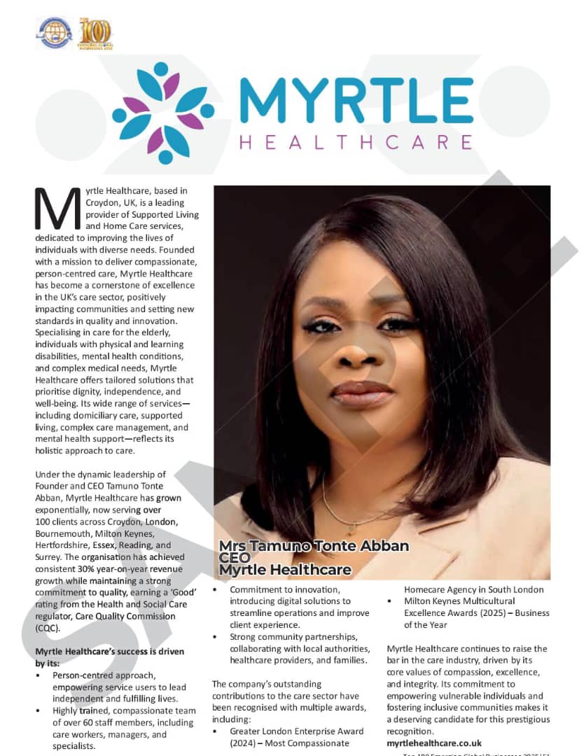 The listing was organised by Leaders Without Borders Development Centre UK which also recognised Myrtle Healthcare for pioneering one of the best privately owned Healthcare Companies in the UK while also utilising innovative modern technologies and best practices in the healthcare sector.