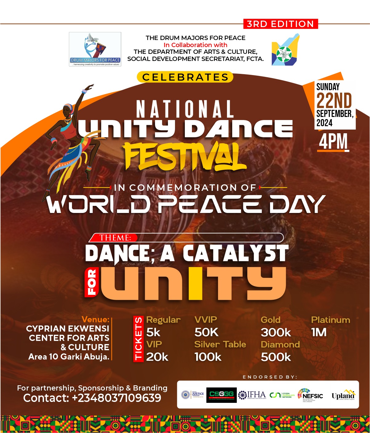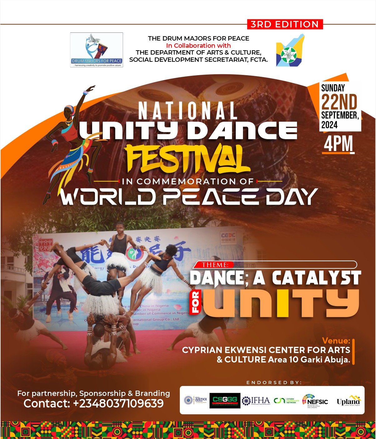 Drum Majors for Peace, in collaboration with the Department of Arts & Culture, Social Development Secretariat (FCTA), is pleased to announce the 3rd National Unity Dance Festival in commemoration of World Peace Day 2024. This event, scheduled for Sunday, September 22, 2024, at 4:00 PM at the Cyprian Ekwensi Center for Arts & Culture, Area 10, Garki, Abuja, will highlight the power of dance as a tool for unity under the theme: “Dance; A Catalyst for Unity.”