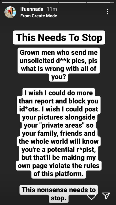 Big Brother Naija star, Ifu Ennada has railed against men who send unsolicited photos of their penis to her.